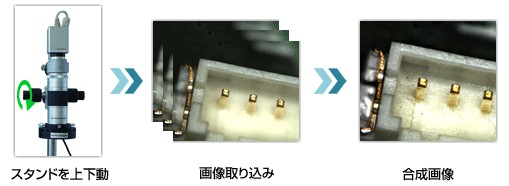 従来観察が困難だった凹凸の大きなワークでも、リアルタイム深度合成なら、
