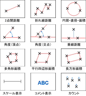 2点間・面積・角度・垂線・バー表示など、様々な寸法計測が可能です。